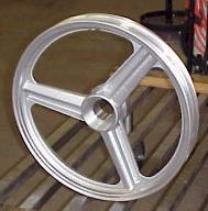 'Do-It-Yourself' Transport Wheels ** Only a limited number of sets available ** We have 3 spoke aluminum rims available for those of you that have access to a machine shop and want to save a few $ making your own T-Wheel hubs. We can provide drawings for the machine work for most chassis. - The wheels are furnished bare w/o any hub installed. Machine up 4 hubs, weld them into the wheel centers and you're done! Call or email for more information. |