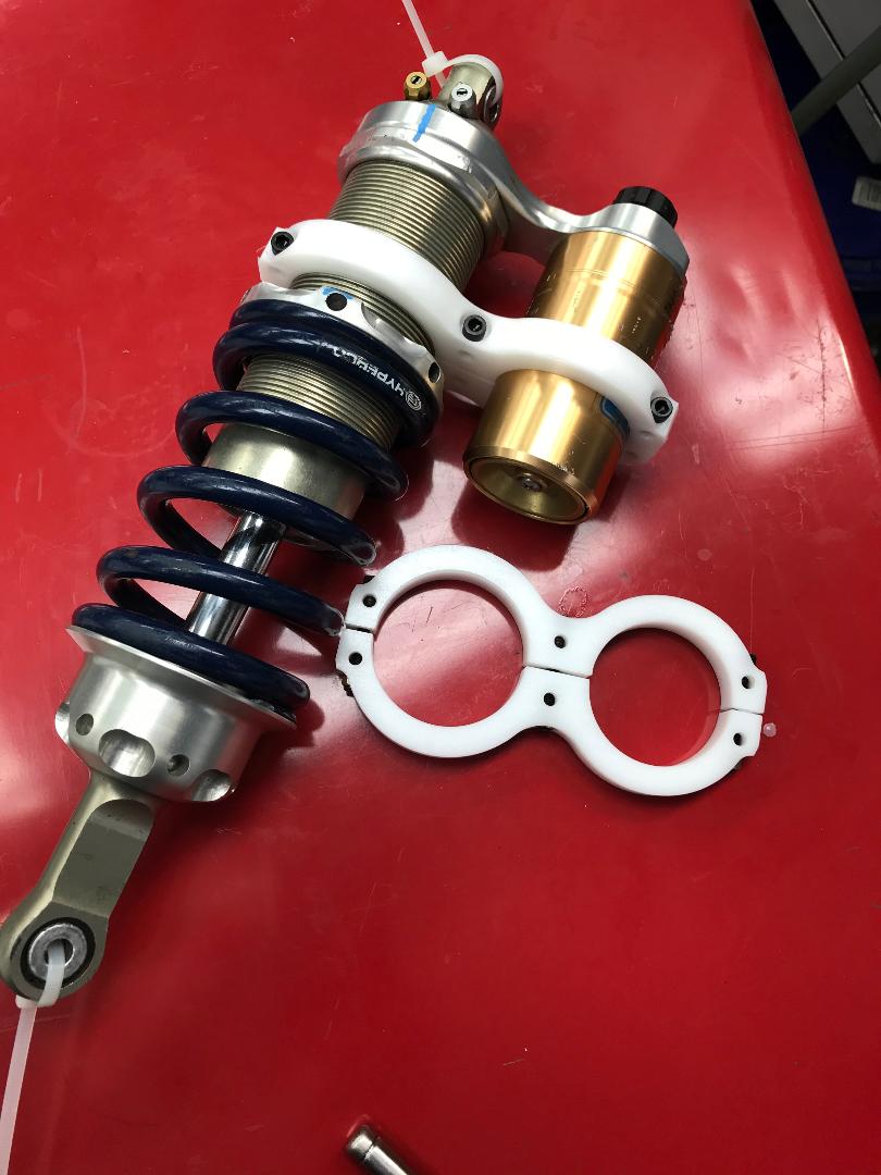 The Ohlins T-44 dampers are a great shock, but the piggy back banjo bridge is prone to cracking. This causes the shock to leak fluid and pressure. These Delrin bridge clamps are designed to give a means of extra support to eliminate this problem. They are 2 piece units that can be installed without the need to disassemble anything. You can do the installation right on the car. Don't wait until yours crack as the replacement banjo bridges are no longer available from Ohlins. Priced per pair @ $75