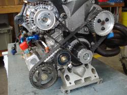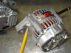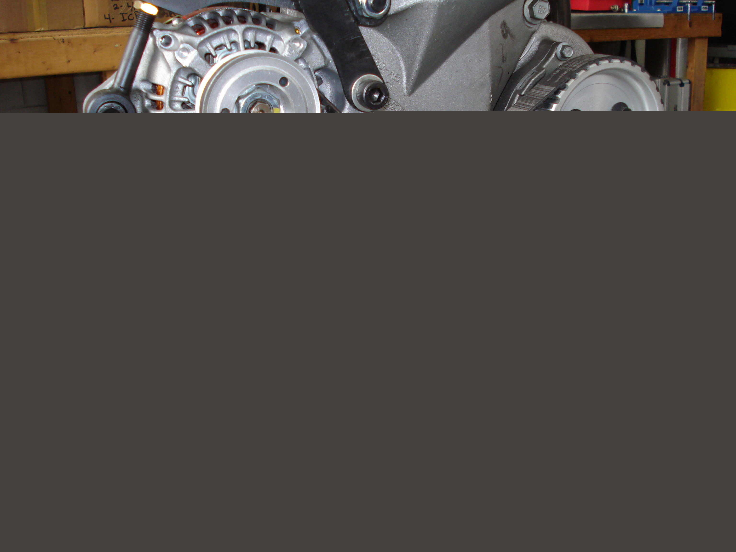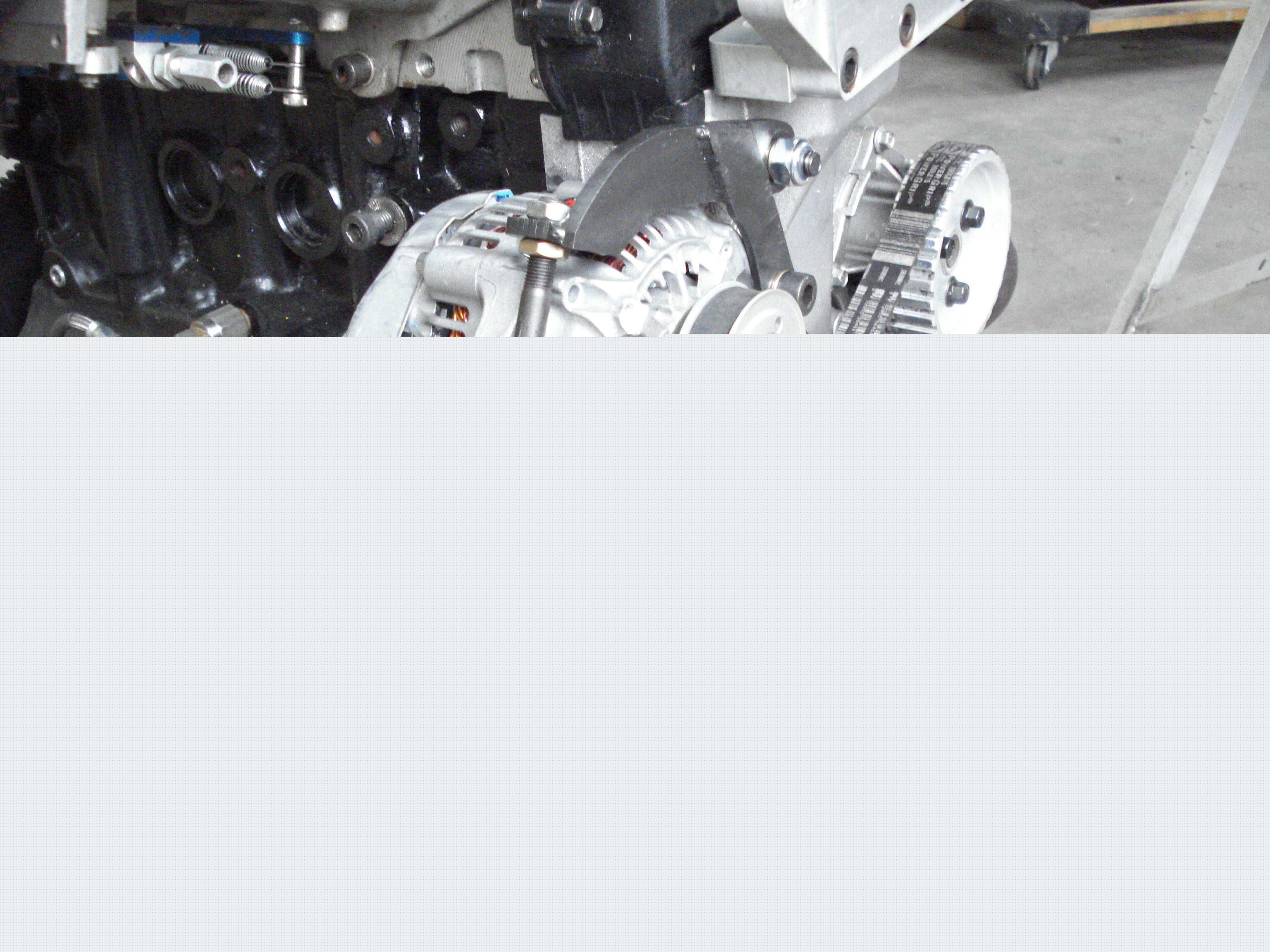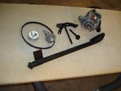 This is the exact alternator set up that we use on the Metrik cars, and this kit fits it to the VanDiemen chassis. It has proven reliable and It Is the same alternator used on the VD axle drive type. As you can see the Pulleys are tooth drive. The initial installation needs to be done with the engine out of the car. The one engine bolt will not come all the way out due to a frame tube. That bolt gets replaced with a 10 mm stud. Once you have done that, the entire mechanism can be removed with the rearward joint in order to remove the alternator. It does necessitate using a new engine bay leg. The new engine bay leg is clocked outward slightly to clear the alternator ear. The original Axle drive alternator unit needs to be re-clocked in the housing. The unit is disassembled and the rear housing is rotated. This positions the electrical stud on the bottom where it is easily accessible. It's a pretty simple straightforward installation. The complete kit consists of a new alternator (that is correctly clocked) (Race Proven mfg), an aluminum alternator pulley, a aluminum crank pulley , a crank pulley spacer that has the key way for the crankshaft, a longer crank bolt, the keyway, the belt, the belt adjuster banjo bolt, the mounting bracket, a 10 mm stud and the new engine bay leg.