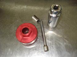 A 7/8" SPARK PLUG SOCKET, 1/4 DRIVE EXTENSION, 10mm SOCKET WILL INSTALL THE PULLEY NUT - THE METRIK ALTERNATOR PULLEY TOOL IS USED TO INSTALL & REMOVE THE PULLEY